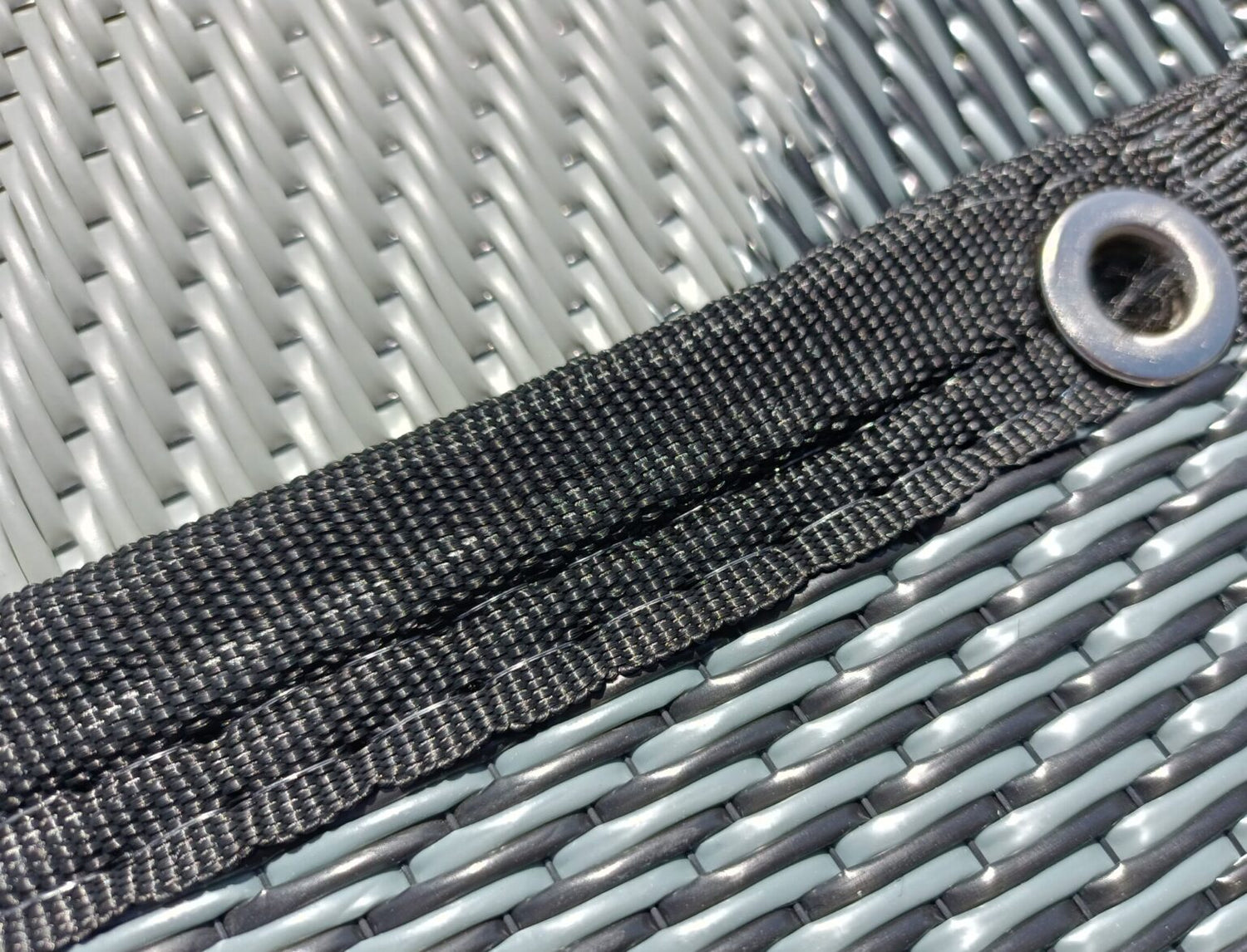 All binding, including the stitching, is crafted from UV-stabilised polyester materials. The binding not only enhances the aesthetic finish of our mats but also provides a robust foundation for our stainless steel eyelets. We use one of the widest bindings available to ensure maximum strength and durability for our mats. Unlike cotton, monofilament threads are chosen specifically for their UV-resistant properties, contributing to the longevity of our products.