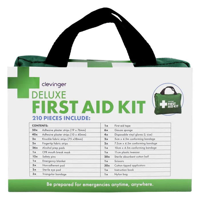 Be prepared for emergencies anytime, anywhere with this comprehensive first aid solution. Suitable for treating cuts, abrasions, sprains, fractures and minor injuries. 210-piece first aid kit includes: 50 x Adhesive Plaster Strips (19 x 76mm) 40 x Adhesive Plaster Strips (10 x 40mm) 2 x Knuckle Fabric Strips (75 x 38mm) 2 x Fingertip Fabric Strips 22 x Alcohol Prep Pad 4 x Antiseptic Wipes 1 x CPR Mouth Breath Mask 10 x Safety Pins 1 x Emergency Blanket 3 x Non-Adherent Pad 2 x Sterile Eye Pad 2 x Triangular Bandage 1 x Instant Cold Pack 1 x First Aid Tape 6 x Wound Dressing 4 x Disposable Vinyl Gloves (M Size) 2 x (5cm x 4.5m) Conforming Bandage 2 x (7.5cm x 4.5m) Conforming Bandage 1 x (10cm x 4.5m) Conforming Bandage 1 x 11cm Plastic Tweezer 20 x Sterile Absorbent Cotton 1 x Scissors 30 x Cotton Tipped Applicators