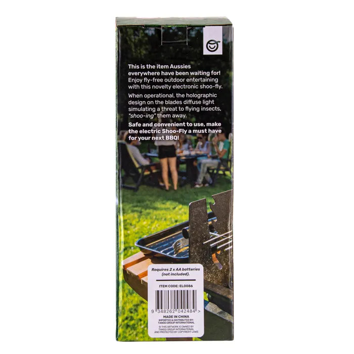 This is the item Aussies everywhere have been waiting for! Enjoy fly-free outdoor entertaining with this novel electronic shoo-fly. When operational, the holographic design on the blades diffuse light simulating a threat to flying insects, "shoo-ing" them away. The soft blades are harmless both to humans and pets. Requires 2 x AA batteries (not included). Safe and convenient to use, make the electric shoo-fly a must have for your next BBQ!